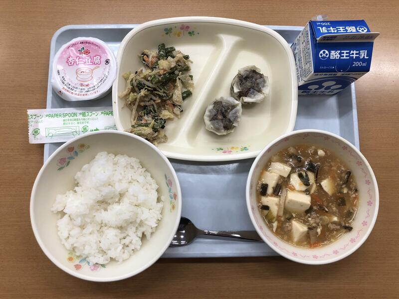 ごはん 牛乳 ひじき入りシューマイ いんげんのごまあえ マーボー豆腐 杏仁豆腐