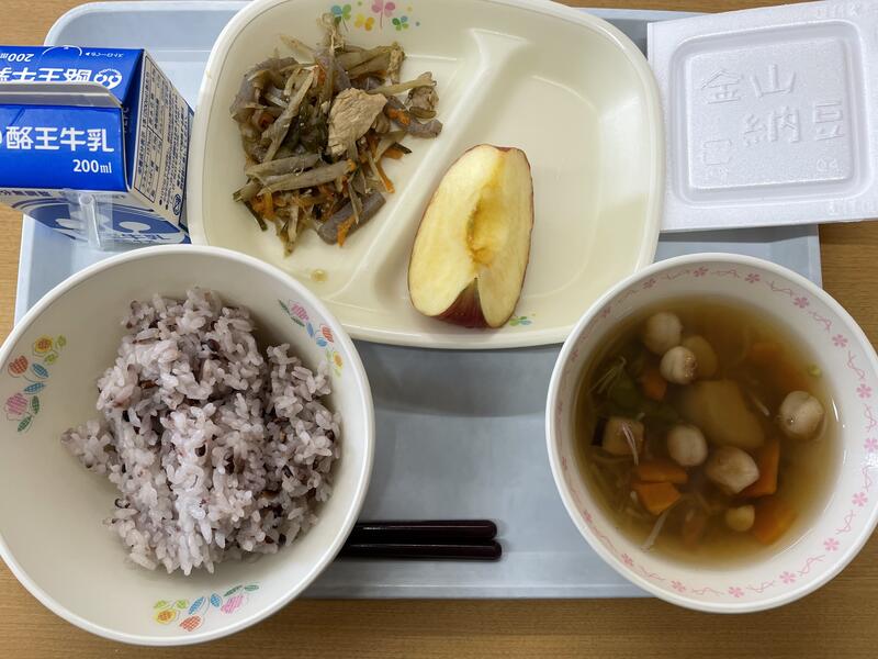 紫黒ごはん 牛乳 納豆 茎わかめの炒め煮 こづゆ りんご