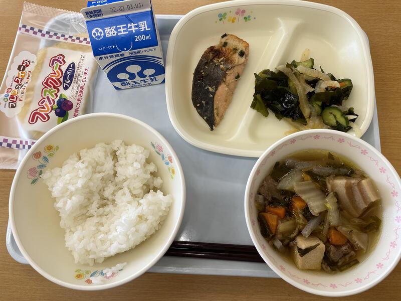 ごはん 牛乳 いわしのかば焼き もみ漬け のっぺい汁 黒糖福豆