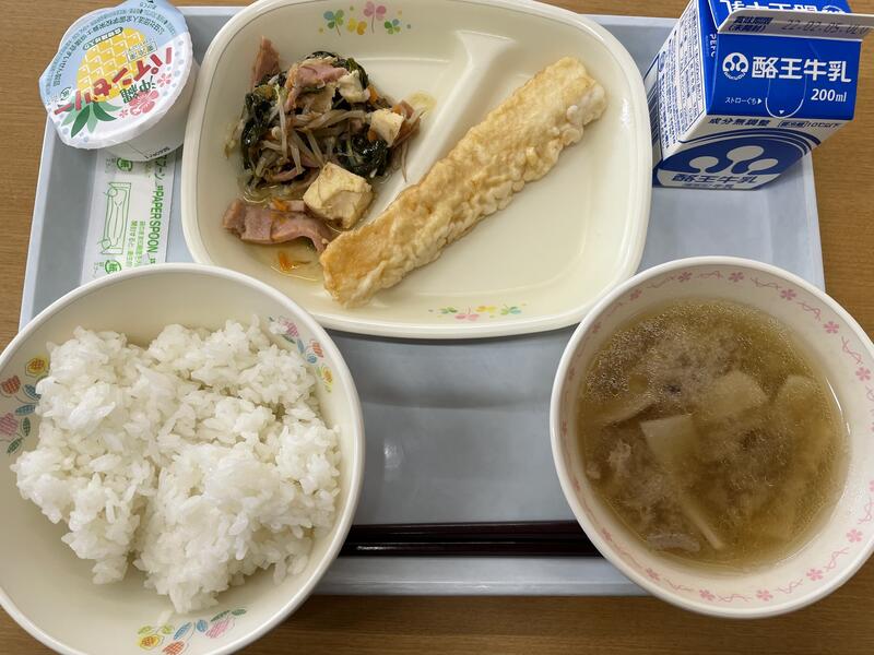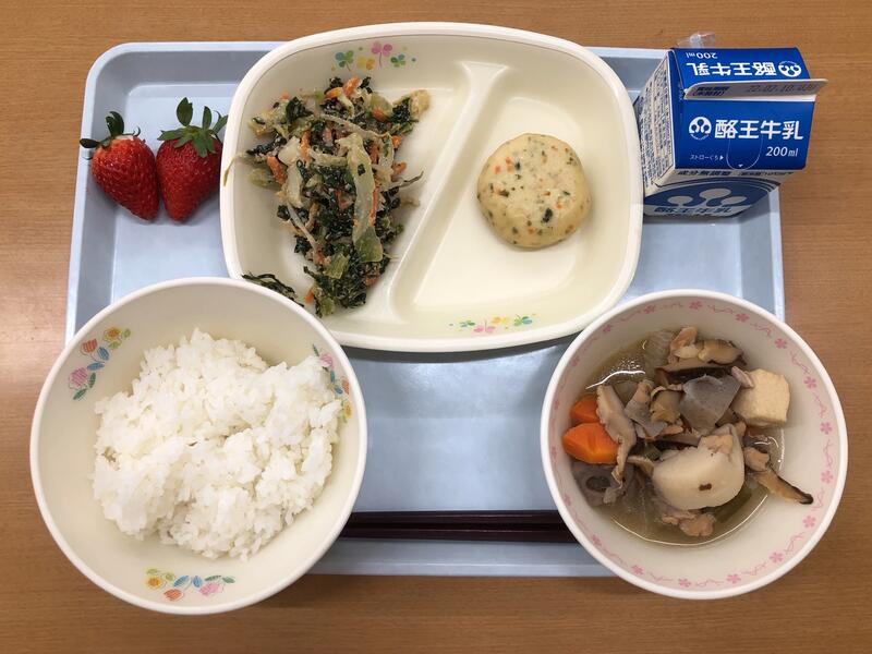 ごはん 牛乳 豆腐の肉みそあん包み ほうれん草のごまあえ ちくぜん煮 いちご