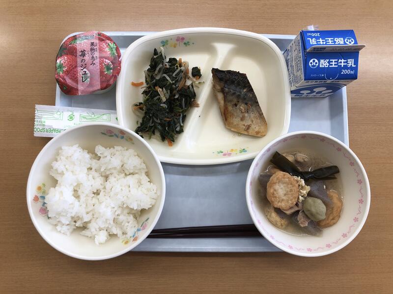 ごはん 牛乳 サバの照り焼き ほうれん草の磯あえ おでん いちごのジュレ