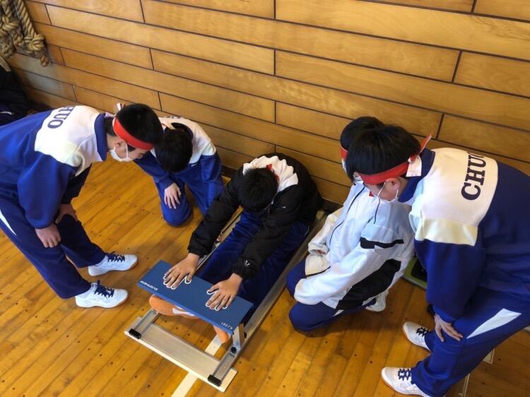 2学期の終業式で、保健体育科から冬休みの宿題が出されました。その内容は「柔軟性トレーニングを毎日続けること」というものでした。中央中全体で柔軟性の低下が見られ、中には怪我をしてしまう生徒も見られました。そのため、柔軟性を向上させるために保健体育科の先生が事前に柔軟性トレーニングを撮影してタブレットで送り、生徒たちはそれを見ながら柔軟性トレーニングに取り組みはじめ、体育の授業や部活動で実際に取り組んでいました。