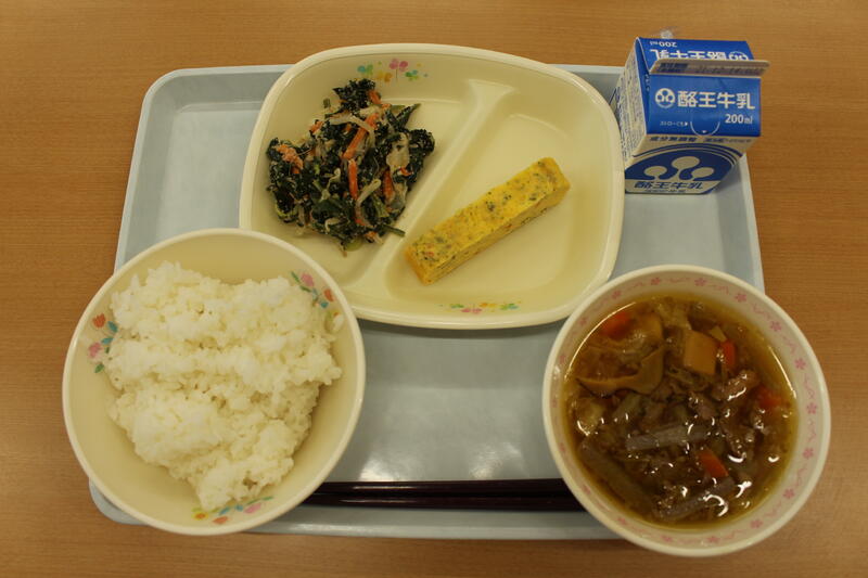 ごはん 牛乳 彩り野菜の厚焼き玉子 ほうれん草のごまあえ すきやき煮