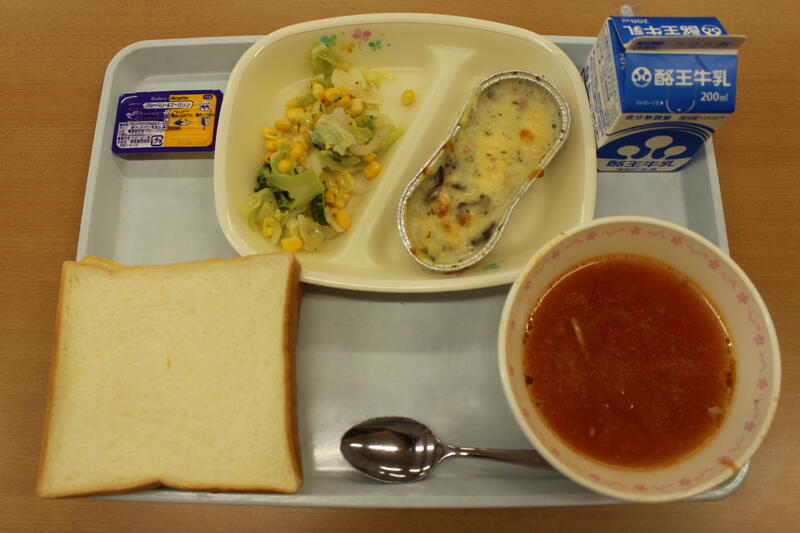 食パン 牛乳 ブルーベリー&マーガリン マカロニグラタン イタリアンサラダ トマトスープ