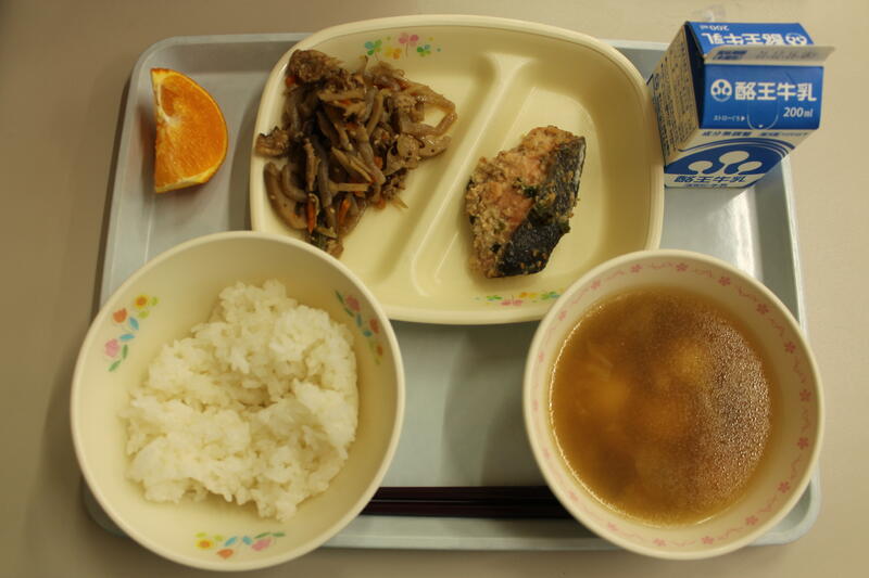 ごはん 牛乳 鮭の三味焼き 五目きんぴら だまこ汁 ゆめオレンジ