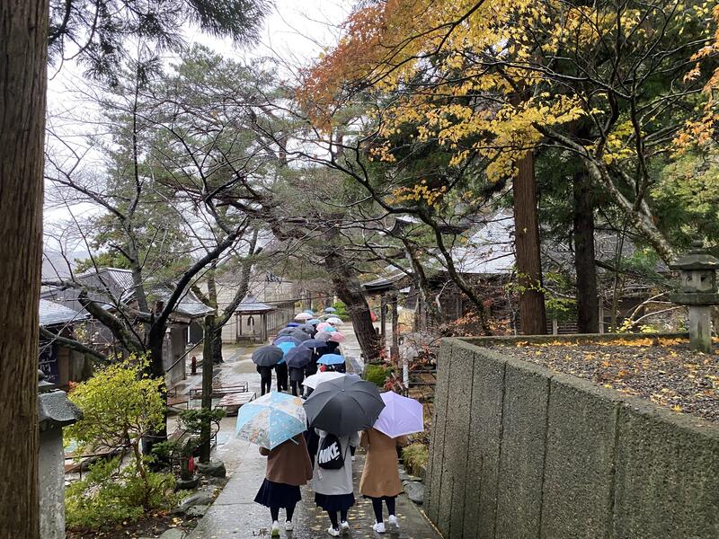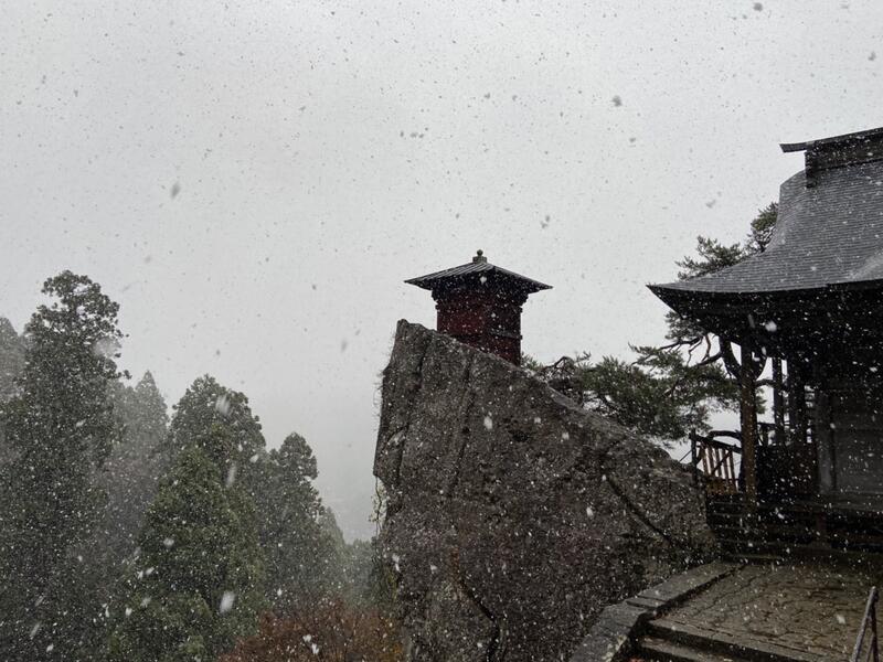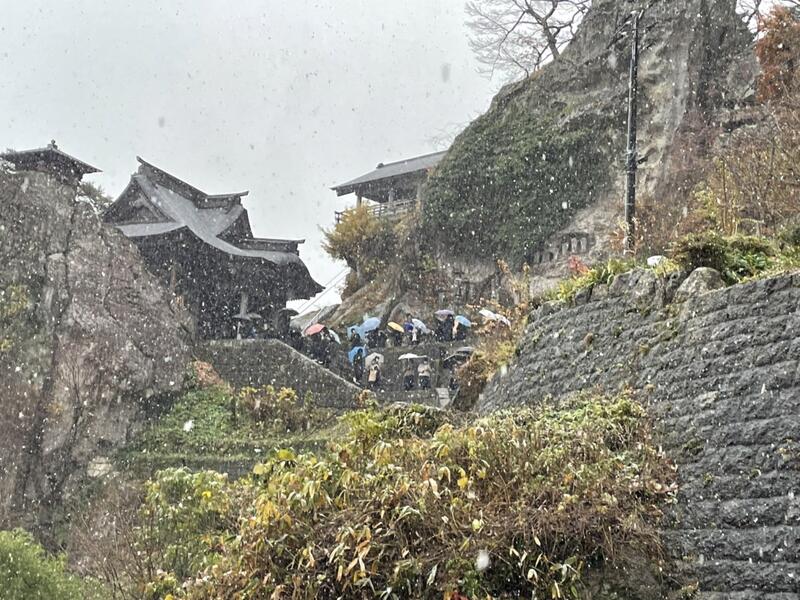 最初の見学地の山寺では、雨が途中から雪に変わりました。安全面を配慮して、山頂までは登りませんでしたが、部活動終えてしばらく経つ生徒たちに、500段近い石段登りはきつかったようです。