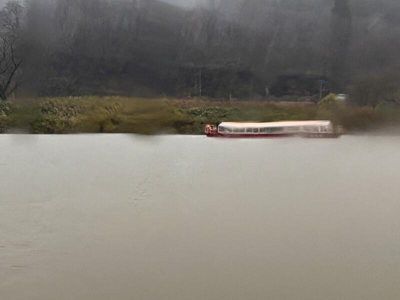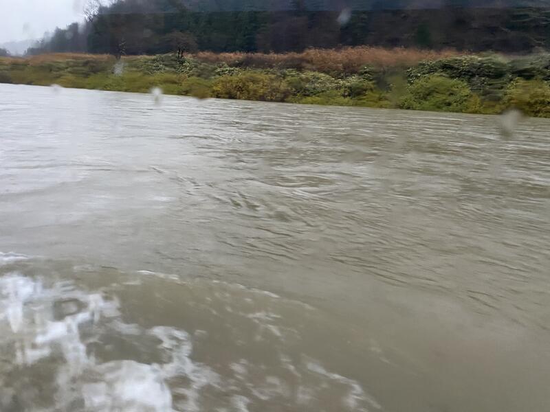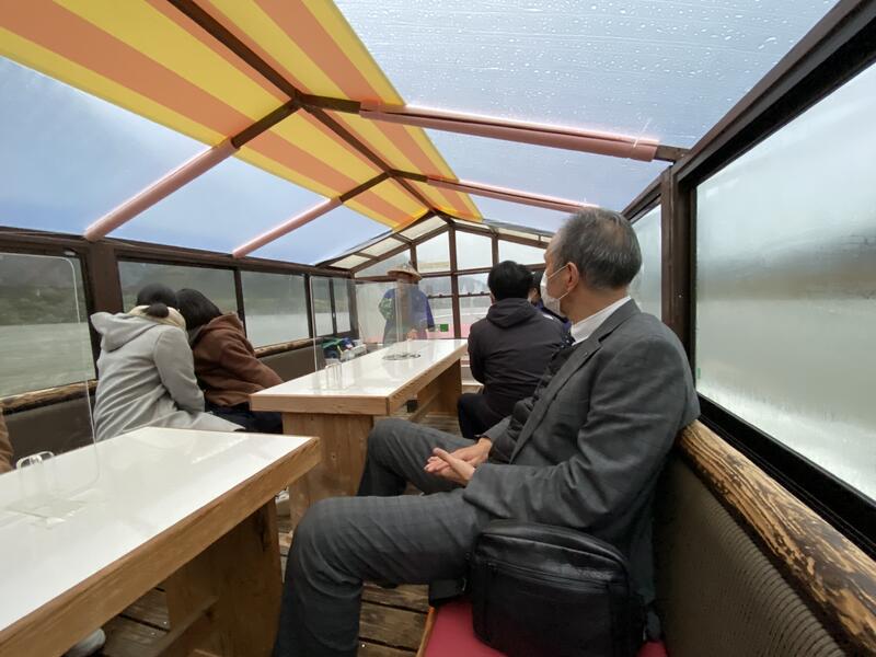 寒河江チェリーランドでちょっと遅めの昼食の後(昼食はほとんどの生徒が完食でした!)、最上川ライン下りへ。天候は雪から雨に持ち直したものの、雨は止む気配はありません。時おり雨が弱まった時にバスから見える虹が、私たちの心を慰めてくれました。