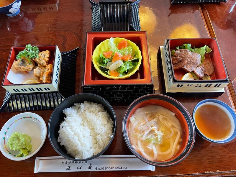 ご飯 けんちんうどん 牛タン唐揚げ 牛タン焼き シーフードサラダ ずんだ餅