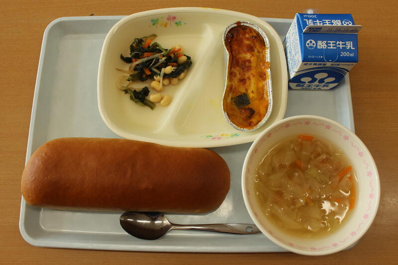 黒糖パン 牛乳 かぼちゃとコーンのグラタン 大豆サラダ 野菜スープ