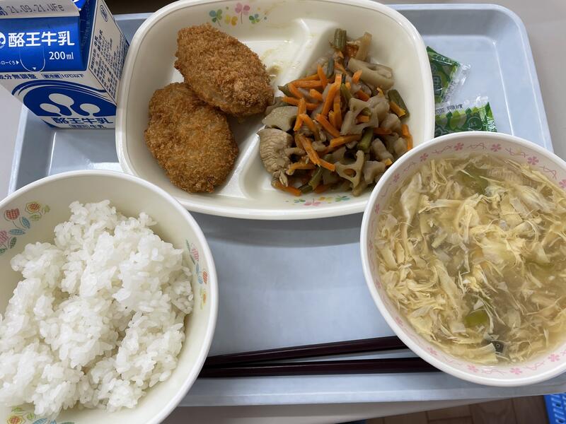 ごはん 牛乳 カツオカツ れんこんのきんぴら かき玉汁