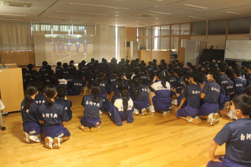 学年壮行会では各部活動からの決意表明のあと、サプライズで先生方からの応援メッセージビデオを流しました。初めての新人戦、2年生のサポート、そして選手としての活躍を期待しています!!!