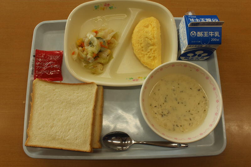 食パン 牛乳 いちごジャム ミートオムレツ グリーンサラダ 白花豆のポタージュ