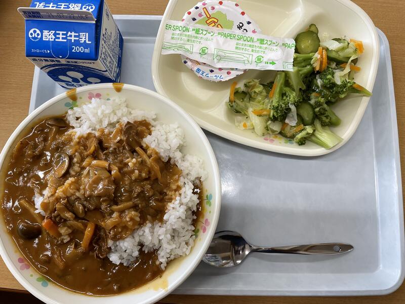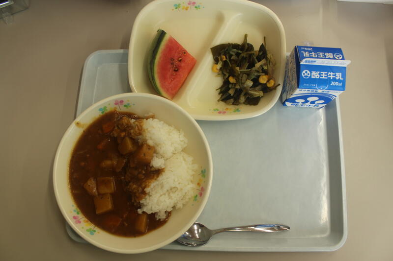 チキンカレーライス 牛乳 海藻サラダ すいか