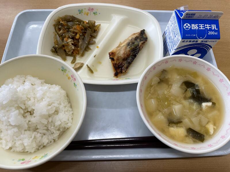 ごはん 牛乳 サバの三味焼き 茎わかめのきんぴら キャベツのみそ汁