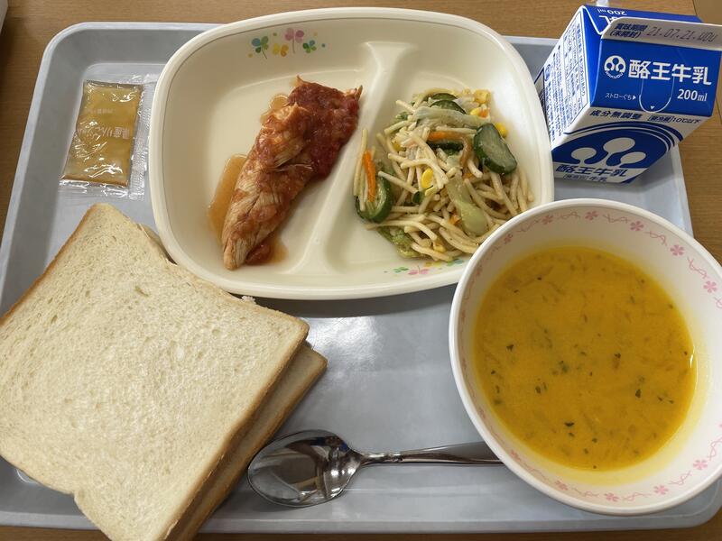 食パン 牛乳 リンゴジャム 伊達鶏のトマトソース煮 サラスパ パンプキンポタージュ