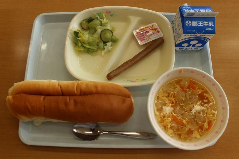 せわれコッペパン 牛乳 ロングウインナー(ケチャップ&マスタード) フレンチサラダ トマトスープ