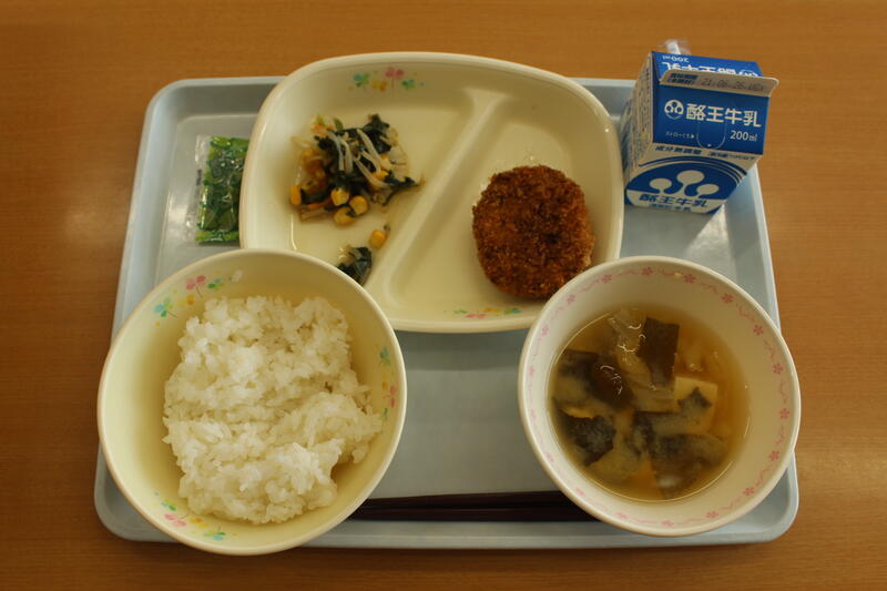 ごはん 牛乳 手作りメンチカツ いろどりあえ 豆腐のみそ汁