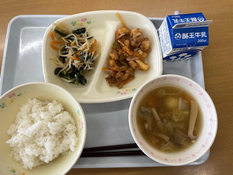 ごはん 牛乳 マダイの甘酢あんかけ もやしのラー油あえ だまこ汁