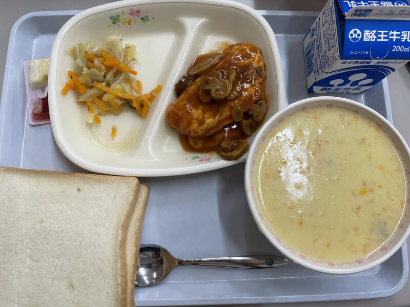 食パン 牛乳 いちご&マーガリン オムレツデミグラスソース オニオンサラダ コーンポタージュ