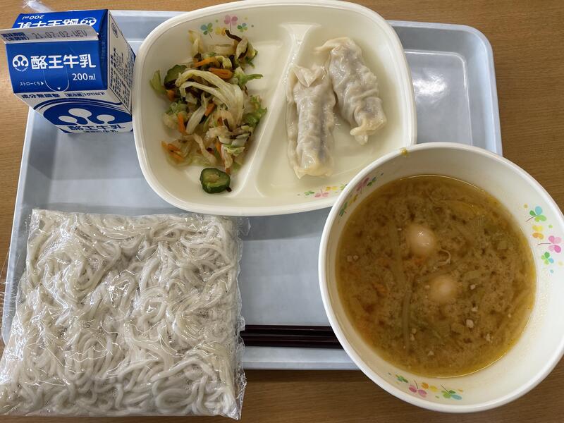 肉みそうどん 牛乳 ぎょうざ 塩こんぶあえ