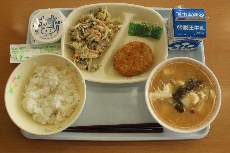 ごはん 牛乳 キャベツメンチ(ソース) ごぼうサラダ なめこ汁 モーモーゼリー