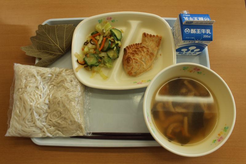 わかめうどん 牛乳 鯛型お好み焼き 塩昆布あえ かしわもち
