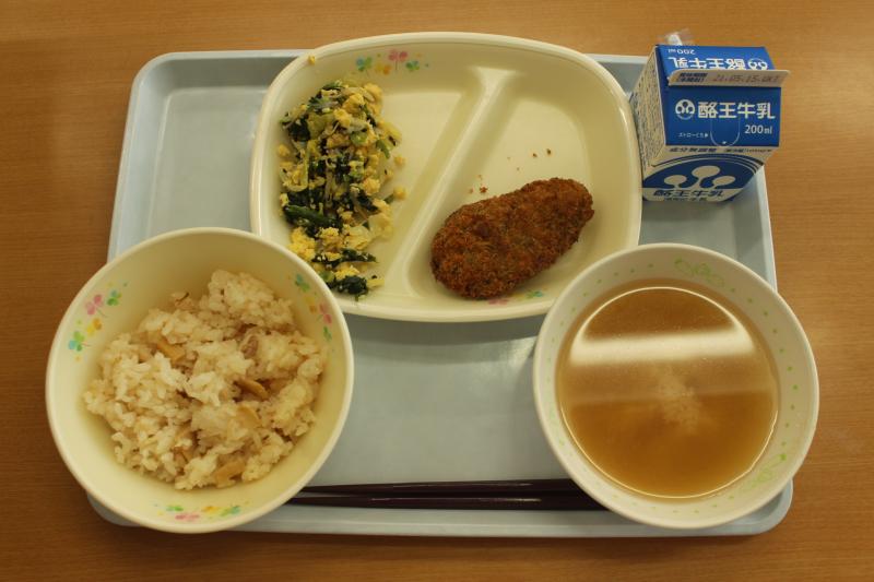 たけのこごはん 牛乳 カツオ磯辺フライ やまぶきあえ 玉ねぎのみそ汁