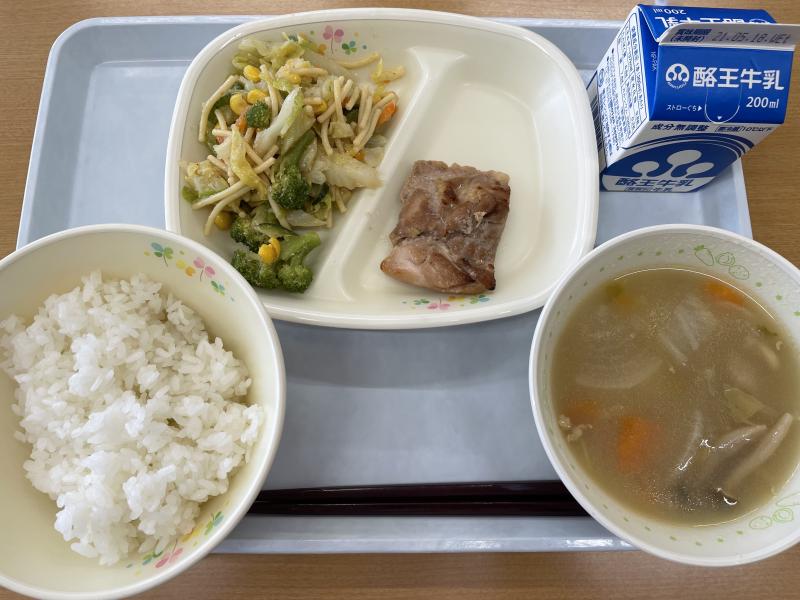 ごはん 牛乳 鶏肉の照り焼き サラスパ いも団子汁