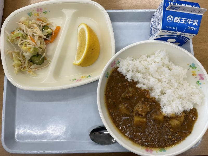 キーマカレーライス 牛乳 糸かまサラダ 河内ばんかん