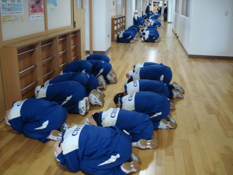 また、その後にはJアラートが発令された際の行動を確認しました。ミサイルが発射されたときには身体を丸め、頭を抱える姿勢をとることが大切になります。今日はどのような姿勢をとるか確認し、実際に廊下に並んで姿勢をとる訓練まで行いました。
