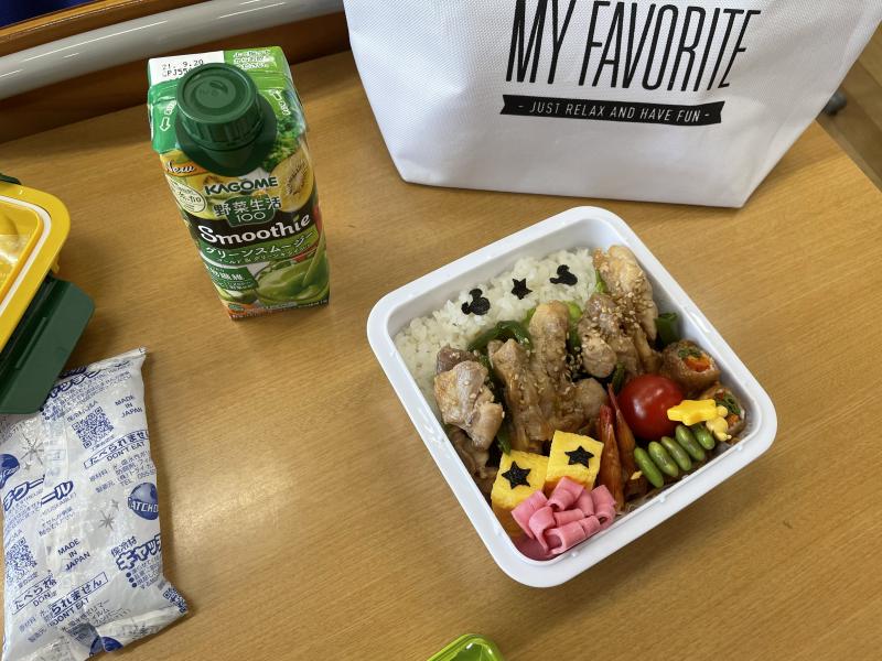 これはとある生徒のお弁当です。愛情のこもった美味しそうなお弁当でした。のりで作られたミッキーや星のワンポイントがとても可愛らしいですね!