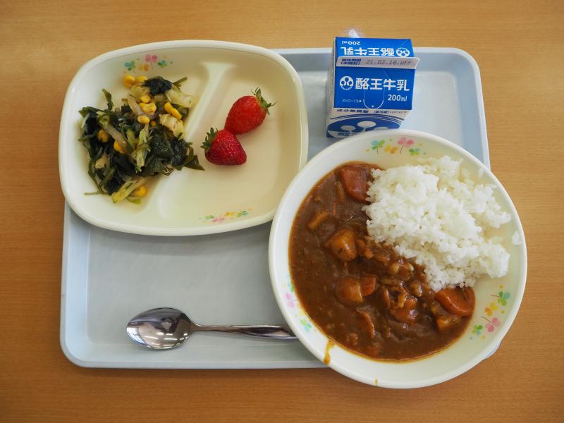 チキンカレーライス 牛乳 海藻サラダ いちご