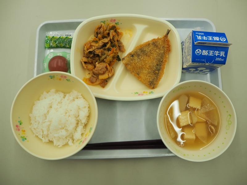 ごはん 牛乳 アジフライ 豚キムチ 具だくさん汁 いちごゼリー