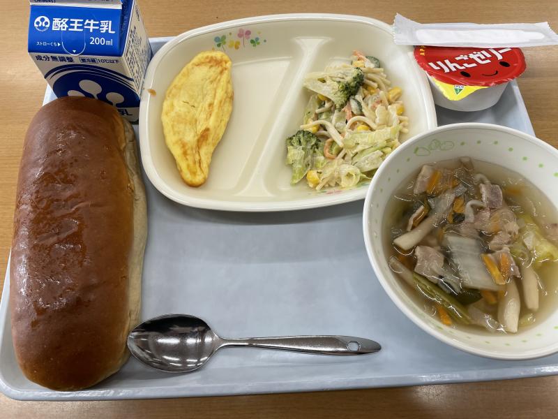 黒糖パン 牛乳 トマトオムレツ サラスパ ファイバースープ りんごゼリー