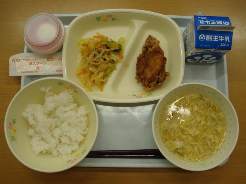 ごはん 牛乳 鶏から揚げ 春雨サラダ かきたま汁 お祝いデザート