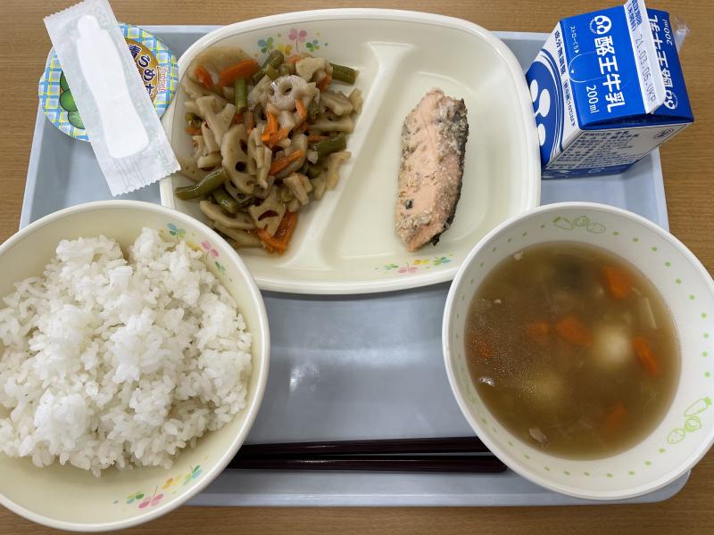 ごはん 牛乳 サケの三味焼き レンコンのきんぴら だまこ汁 うめゼリー