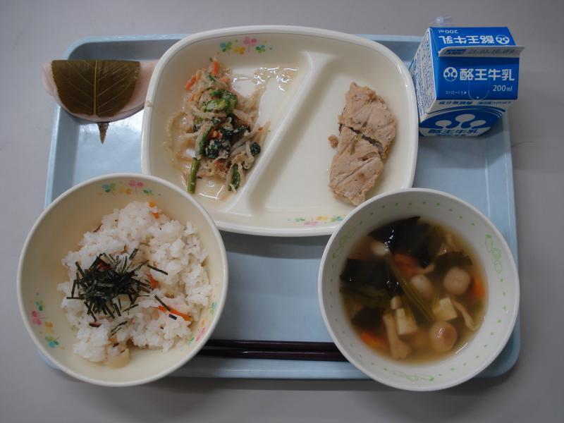 ちらし寿司 牛乳 サワラの香味焼き 菜の花のごまあえ すまし汁 桜もち