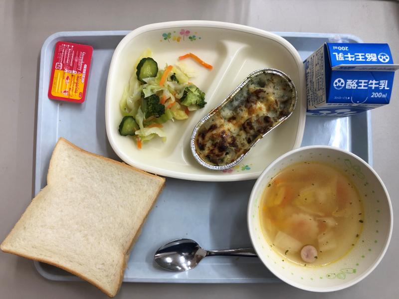 食パン 牛乳 いちご&マーガリン マカロニサラダ ブロッコリーサラダ 白菜のスープ