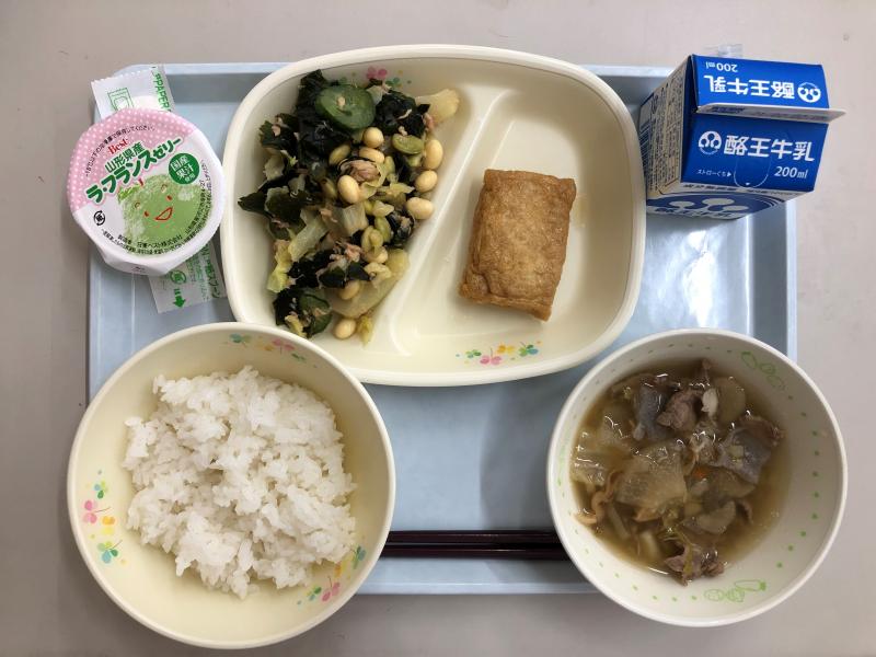 ごはん 芋煮 牛乳 いめこぶくろ だだちゃ豆のサラダ ラ・フランスゼリー