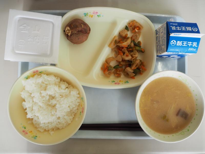 ごはん 牛乳 いもがら汁 レンコンのきんぴら 納豆 やきいも
