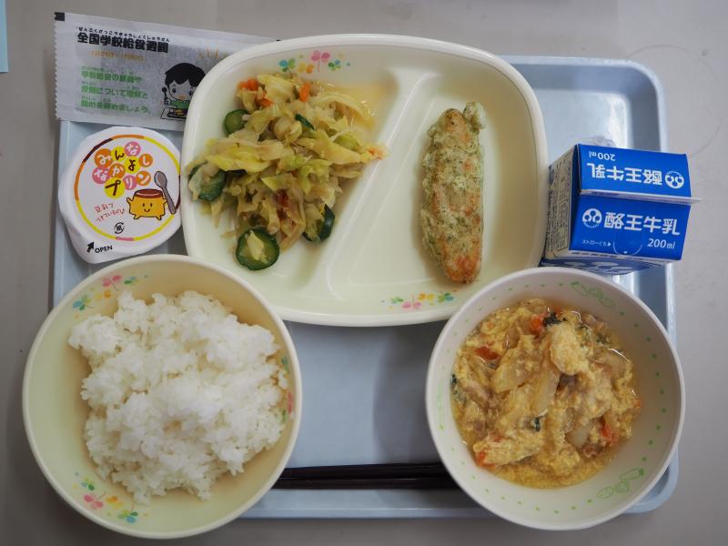 ごはん 牛乳 油麩入り親子煮 笹かまのいそべ揚げ ずんだ和え プリン 味付けのり