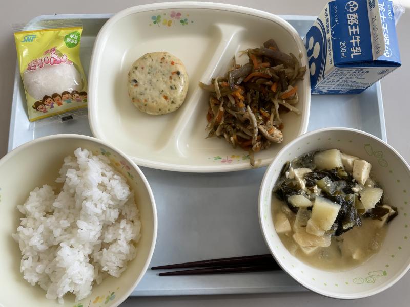 ごはん 牛乳 豆腐の肉みそあん包み 茎わかめのきんぴら じゃがいものみそ汁 立春大福