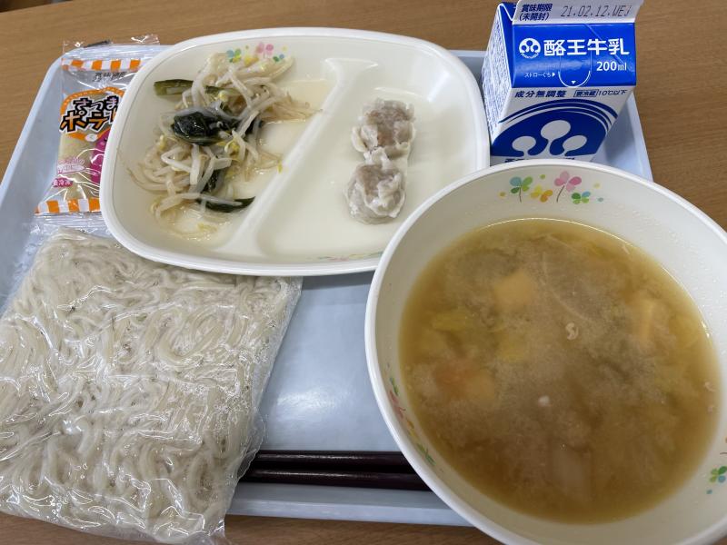 けんちんうどん 牛乳 シューマイ もやしサラダ さつまポテト