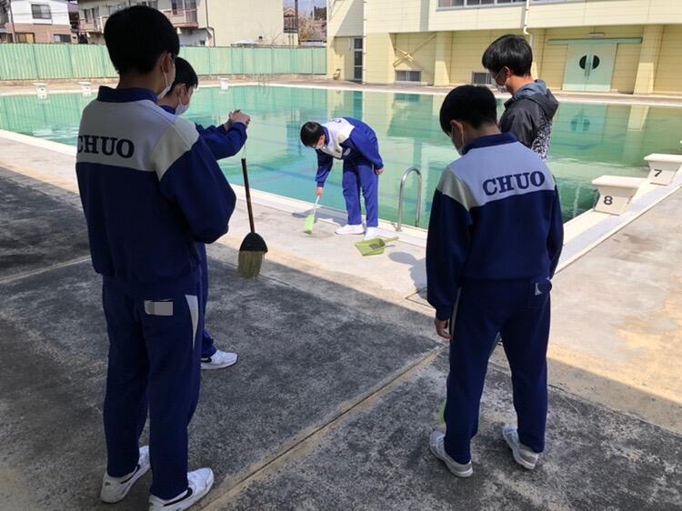 水泳部はこの時期だと気温が低くプールには入ることができませんが、時間を有効に使って部活動に励んでいます。今日はプールの清掃を行なっていました。ここでも中央中の「自問清掃」が徹底されています!
