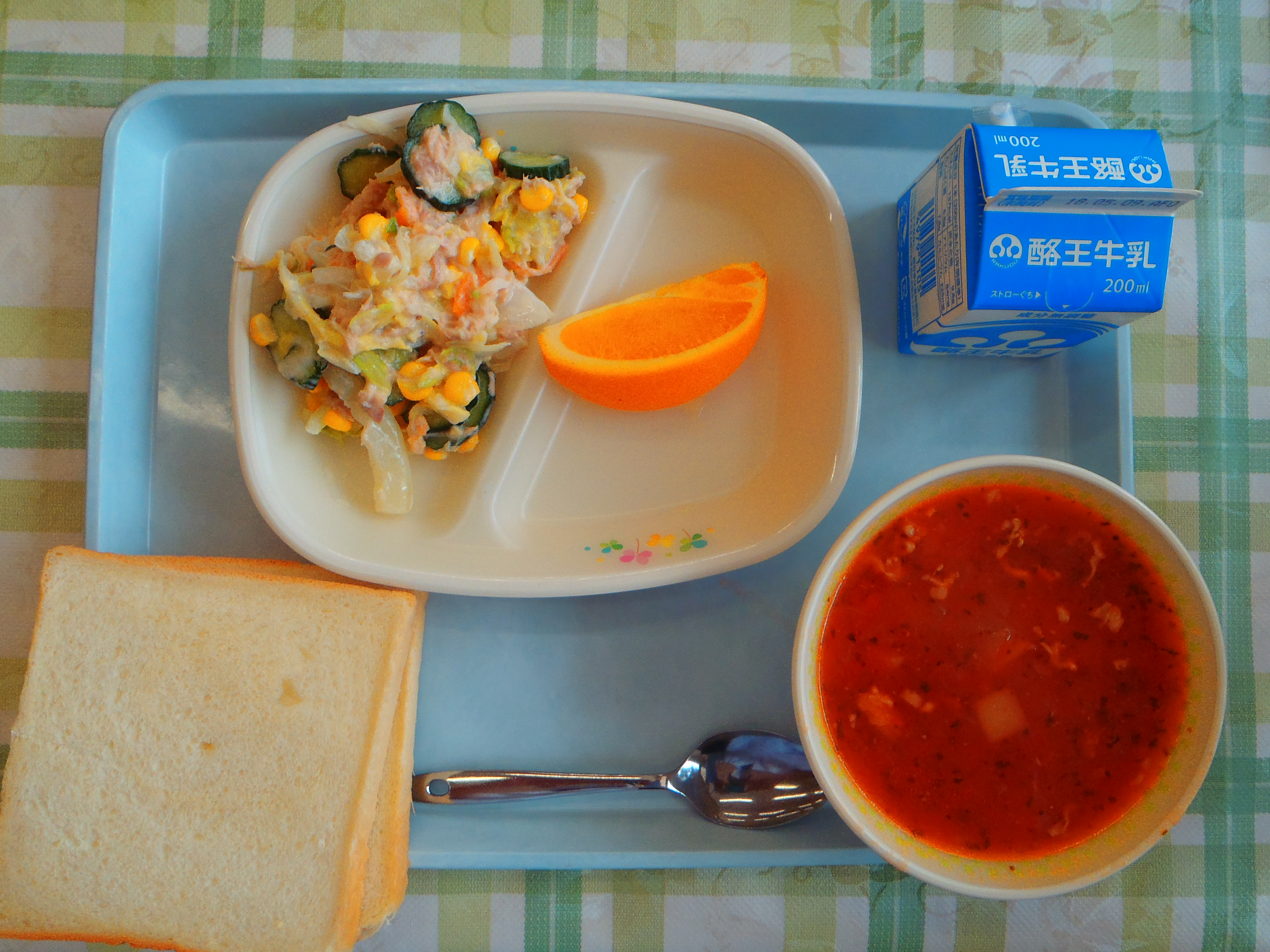 食パン ポークビーンズ ツナサラダ オレンジ 牛乳