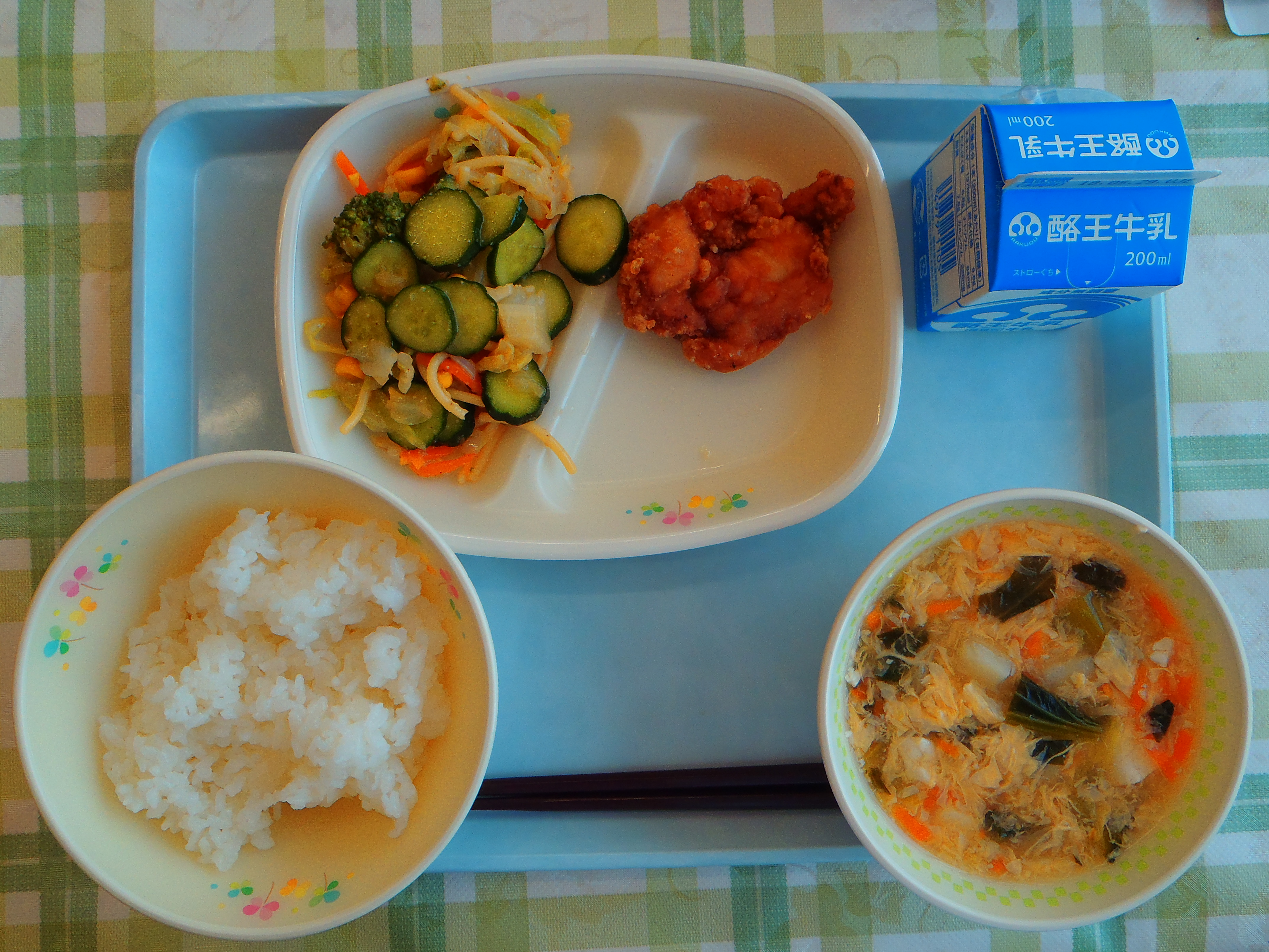 ごはん かきたま汁 サラスパ 鶏肉の唐揚げ 牛乳