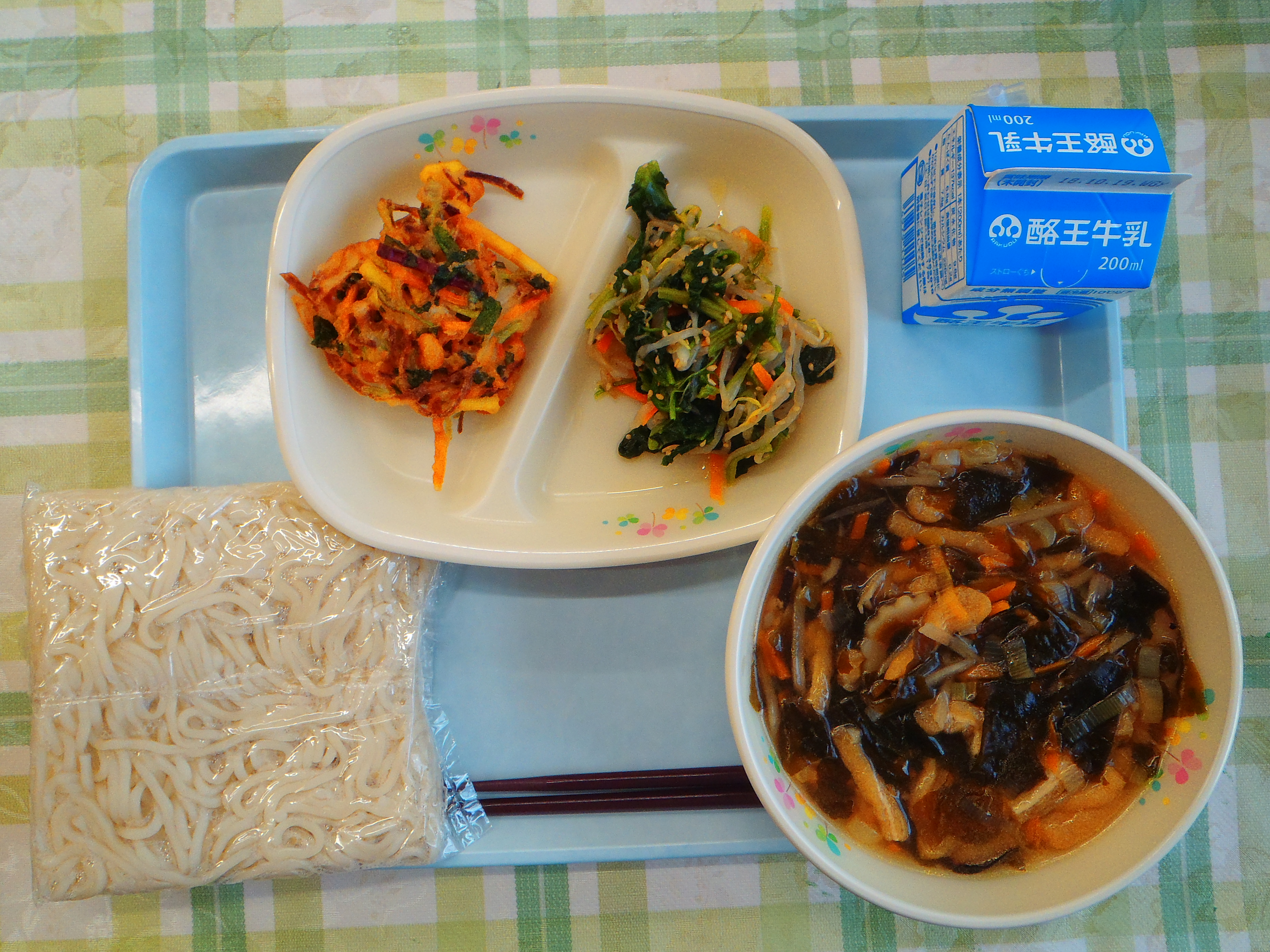 わかめうどん 手作りかき揚げ ごま和え 牛乳