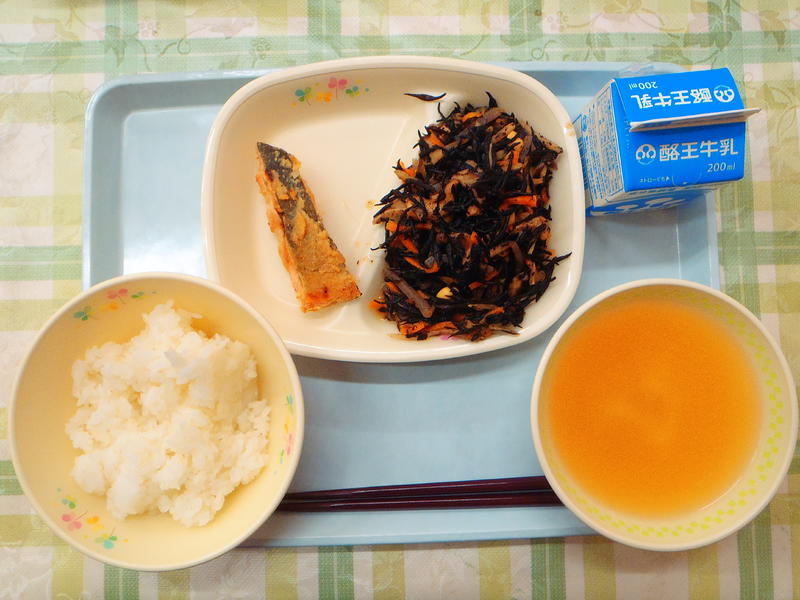 ごはん 大根のみそ汁 サケのごま味噌焼き ひじき煮 牛乳