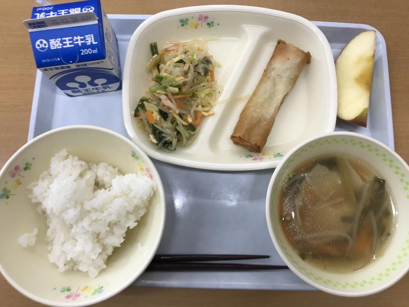 ごはん 牛乳 春巻き 中華サラダ ワンタンスープ りんご