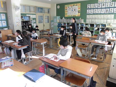 冷え込みの厳しい朝でした。2校時目の授業の様子です。1年生は体育の授業でした。マット運動の後ろ回りの練習を一生懸命行っていました。3年生は音楽の授業でした。「ふじの山」を聞いたり、歌ったりしていました。6年生は書写の授業でした。「雪の連山」の練習をしていました。今日も子どもたちは集中して学習に取り組んでいます。